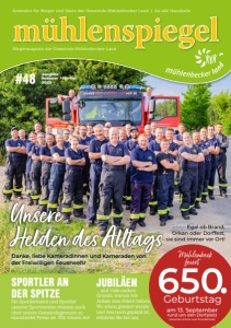 Ausgabe Sommer / Herbst 2025 #48 Danke, liebe Kameradinnen und Kameraden von der Freiwilligen Feuerwehr SPORTLER AN DER SPITZE Die Sportlerinnen und Sportler unserer Sportvereine räumen auch über unsere Gemeindegrenzen so mancherlei Preise ab. Wir wissen wo! Kostenlos für Bürger und Gäste der Gemeinde Mühlenbecker Land | An alle Haushalte Bürgermagazin der Gemeinde Mühlenbecker Land 650. Geburtstag am 13. September rund um den Dorfplatz (zwischen Kirche und Grundschule) Mühlenbeck feiert JUBILÄEN ... und viele andere Gründe, warum wir Anlass zum Feiern haben. Wo schon gefeiert wurde und was noch geplant ist, erfahren Sie bei uns Unsere Helden des Alltags Egal ob Brand, Orkan oder Dorffest, – sie sind immer vor Ort!